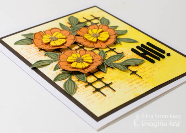 Stamp flowers and leaves on pieces of colored cardstock. Stamp each flower twice; first on orange paper and then on yellow. Cut out. Layer each flower center on a base flower. Attach using 3-D foam stickers.