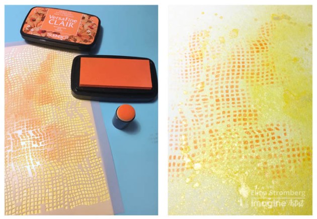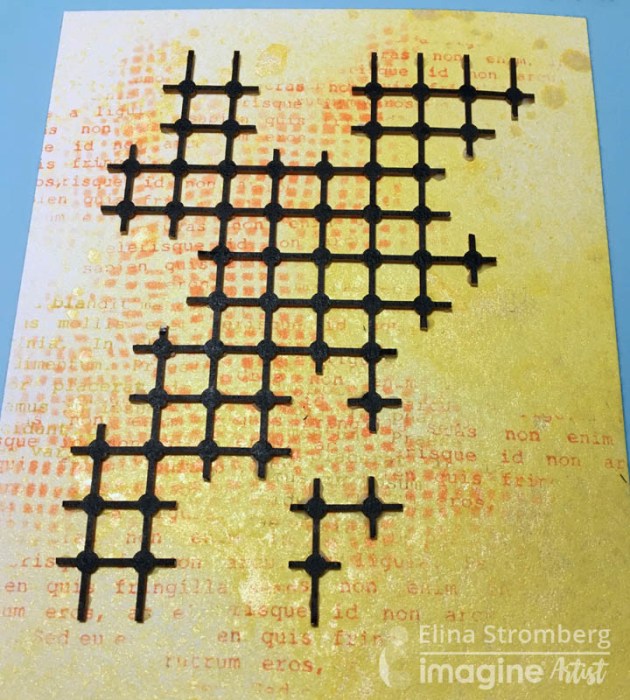 Stamp patterns on the yellow stenciled paper, using the same orange ink. Glue the colored chipboard grid on the paper.