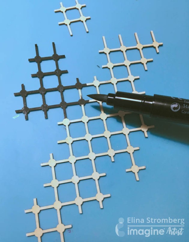 Shape a chipboard grid by cutting out some parts with scissors. Color the plain chipboard with a Fabrico Pen in Real Black.