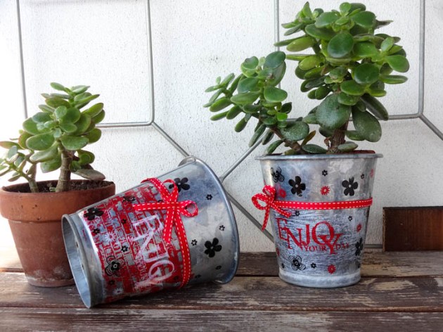 Clean well the surface of the flower pots. Stamp with the brick wood stamps using the StazOn Pigment Snowflake and Passion Red ink pads to cover around and about ¾ of the height of the flower pots.
