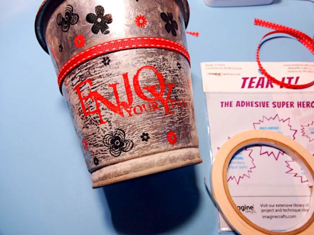 Place Tear It! Tape on the end of the brick and wood stamps used as background designs and set the ribbon.