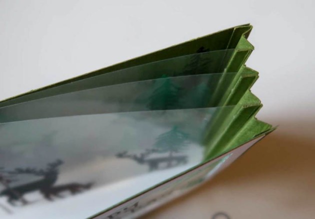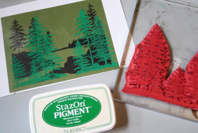 Tunnel cards just got that much cooler because of StazOn Pigment Inkpads! You can now stamp on acetate and really build up those layers without all of the cutting and snipping like traditional tunnel cards. With the help of StazOn Pigment Inks simply stamp on acetate panels, use Tear It! Tape to affix the panels to the accordion sides and you’re good to go! It takes a matter of minutes instead of hours!