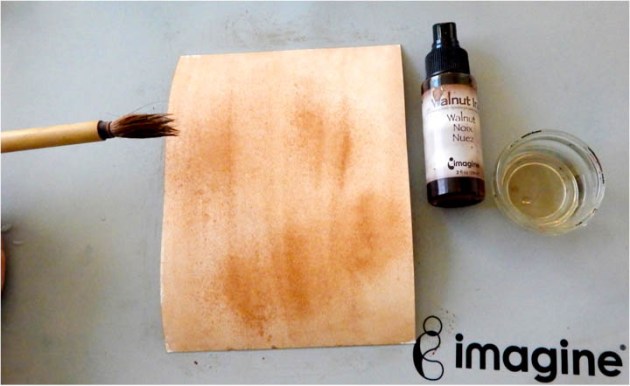 Spray some Walnut Ink, then brush the ink with a wet brush. Dry paper.