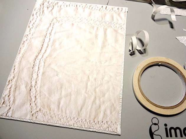 Cover the inside of the book covers with the scrapbooking paper, again using the Tear It! Tape.