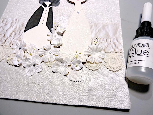 Add drops forming a pearl-like necklace on the bride cat with the irRESISTible Pico Embellisher Wedding dress and adhere the Vertigo shapes with the On Point Glue.
