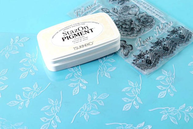 April is the month of white weddings here at Imagine. With the new addition of StazOn Pigment, this month is going to be amazing. I can’t imagine life without StazOn pigment and can hardly remember the ways back when. So let’s explore this amazing ink some more with this Save the Date card.