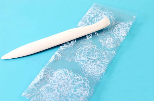 Mist a piece of ribbon using Sheer Shimmer Spray in Frost. The spray gives the ribbon an off-white finish that is gorgeous. Dry the ribbon with a heat tool.