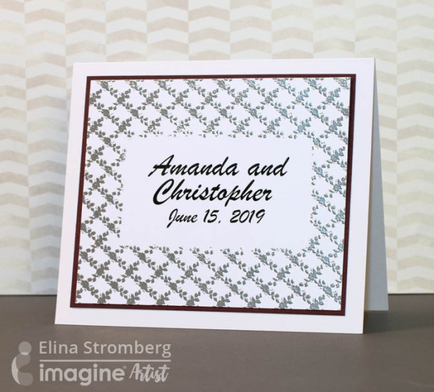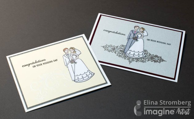 Attach the layered card front to the card base. Trim to size if needed. Glue the main image on the card front. Embossing powders come in various colors, and especially the metallic colors work perfectly on all wedding themed projects. I created a second version of the same card design, but instead of a white swirl I used a silver ornament pattern for the background decoration: A great wedding invitation design looks elegant and beautiful but is quick and easy to make even in greater quantities. Stamping is a simple way to decorate the invitation card, and the choice of patterns and stamping colors can be used to give a hint of the wedding theme or the theme colors you’ve chosen for the reception.