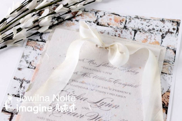 The versatility of stamps and ink is the best part of my everyday. When it comes to making beautiful cards or wedding invitations the sky is the limit. I wanted to see how the new StazOn pigment would work on various handmade papers that I often use for invitations and there’s no surprise that this ink is made for so much more than the ordinary. Take a look at what I stamped on this invitation all using this amazing ink.