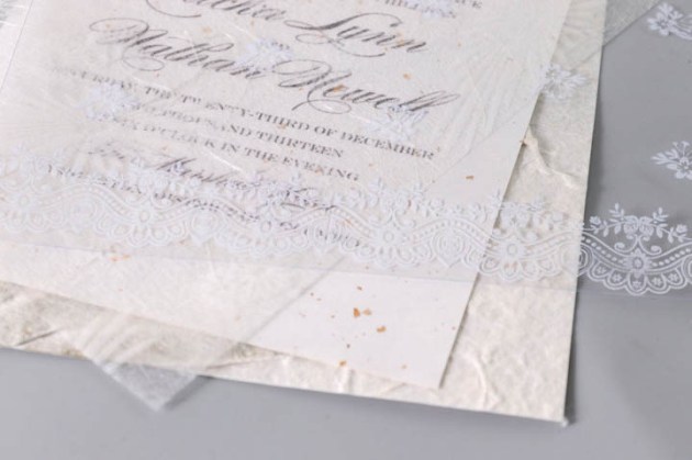 Layer a handmade piece of textured paper at the bottom, then the invitation details portion, handmade silk paper with the stamped acetate on top of it all. Adhere the paper pieces together with On Point Glue using a small drop only.