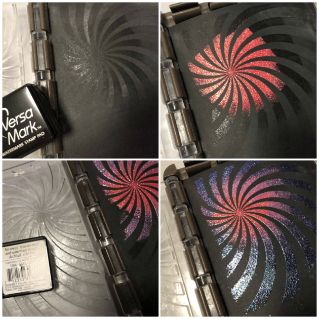 I started my process using basic black card stock and the small inkpad (or cube) of the VersaMark. I placed my stamp inside of my stamping tool and applied the ink starting in the center. I stamped this part and covered with Valentine Mboss. Then I removed the card stock and melted the powder with the heat tool. I repeated the process several times using Princess Party, Birthday Party, Sparkle, and Lucky Stars. I applied VersaMark in a circular way to keep the spiral shape.