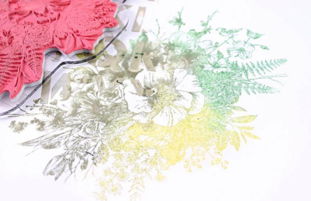 Ink a large floral stamp using Memento Dew Drops in 3 shades of green. See product list below.
