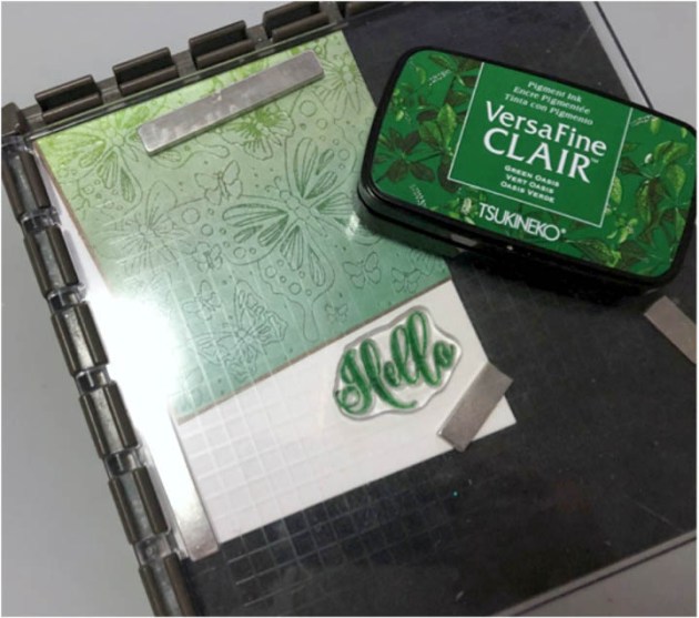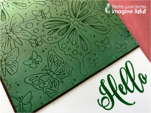 After heat embossing and using an InkBlusher, I applied Delicata Pigment Ink in White Shimmer directly over the heat embossed background. At this stage, you will notice how the embossed butterflies fine lines did not absorb the pigment ink and the background color looks softer.