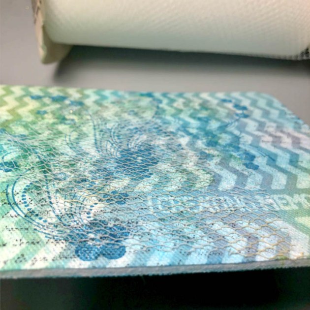 Apply a trio of Fireworks! Sprays to add color, allow to dry. As you can see the color of the waterbased inks brings out the chevron design that was preprinted.