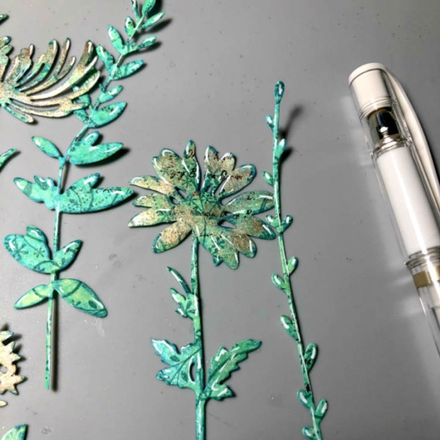 Assemble floral die cuts, adhere sequence, and apply StazOn ink directly to edges of cover for shading.