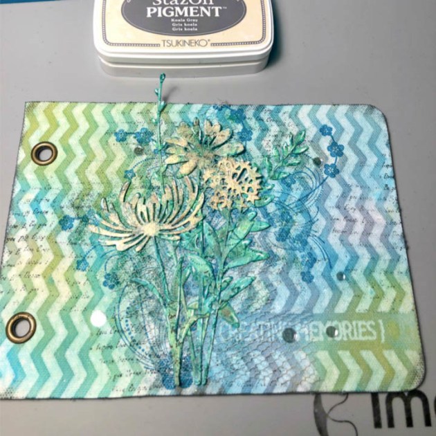 Directly apply VersaMark ink to cover, sprinkle with MBoss powder(s) and heat set for added texture.
