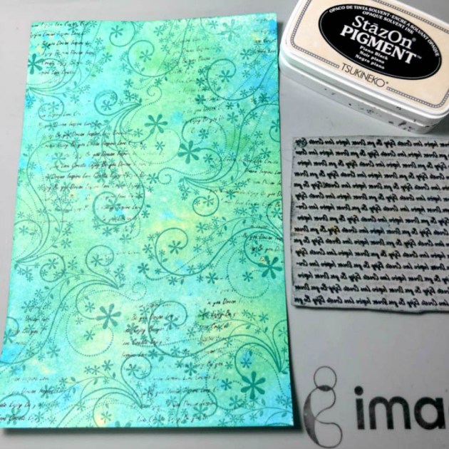 Stamp swirls and script randomly onto the card stock panel with StazOn Pigment ink.