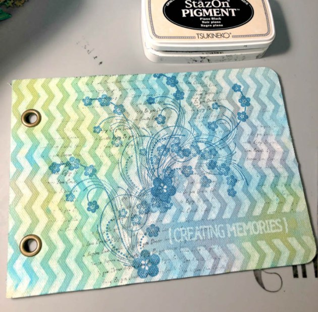 Stamp a floral pattern and script onto journal cover with StazOn Pigment ink.