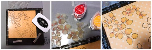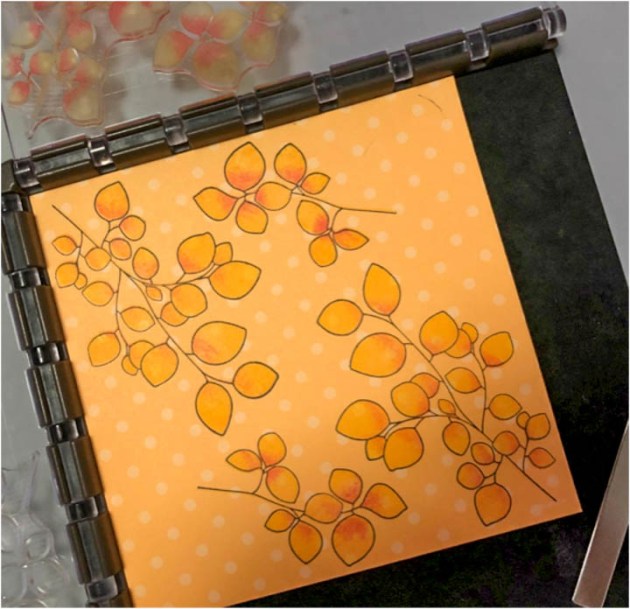 Remove the lineal stamp and place the solid stamp over the lineal stamp and pick up with the acrylic door. Ink the solid images entirely with Mango Madness VersaMagic Ink and stamp. Ink up a few touches on the insides of the leaves with Red Magic VersaMagic Ink and stamp. I used the DewDrop inkpads in VersaMagic because with the teardrop shape it is very easy to add the selective color to the images without getting the second color accidentally over the whole image.