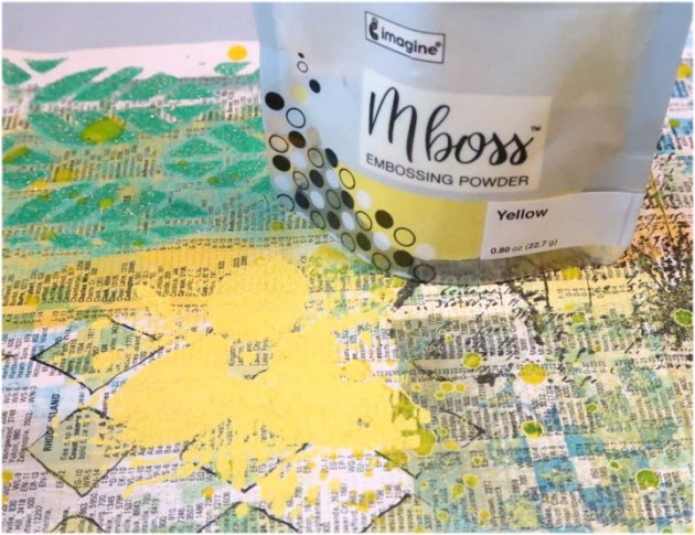 Sprinkle Mboss Lucky Stars embossing powder over the ink; shake off the excess and return it to the handy space-saving pouch. Heat the embossing powder to melt.