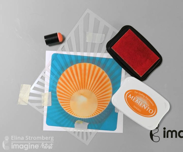 Place a pattern stencil on the inked card front and layer the circle stencil on top in its original position. Ink the circle area with orange Tangelo Memento ink. Remove both stencils. TIP: For the second inked layer, any patterned stencil can be used. For catching all the details of the stencil pattern use the smaller Sponge Dauber for inking.