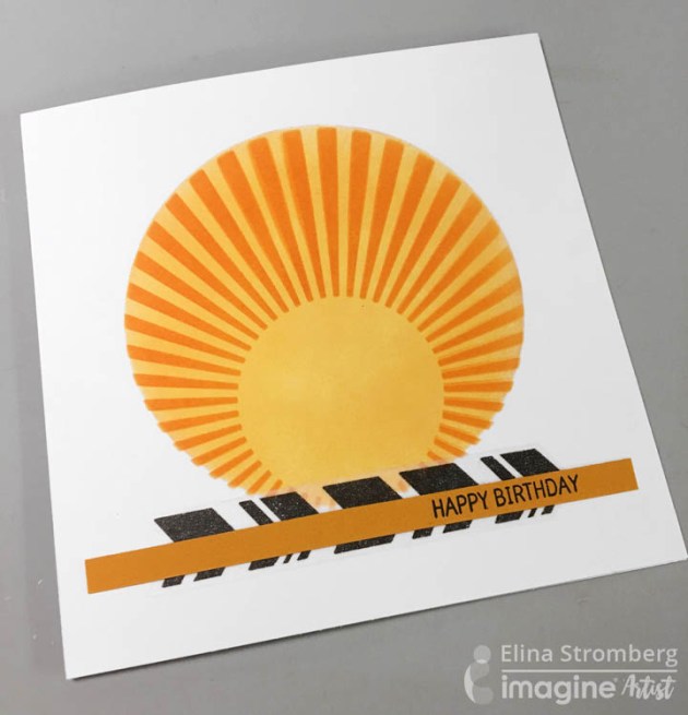 Fun stamped characters and bright ink colors are a joyful combination. I placed my cute dog image on a bright yellow background that was inspired by our warm July color of ‘Tuscan Sun’. I inked the background pattern directly on the folded card base: First, I stenciled a large yellow circle on the card and then inked another patterned layer on top. This double stenciling technique is super easy and using just a part of your stencil pattern makes your old stencil look cool and fresh again! If you don’t have a circle stencil you can cut it from paper or a piece of film/plastic sheet. And instead of a circle, you can use any shape you wish: an oval, a heart, a triangle, a hexagon…the possibilities are endless!