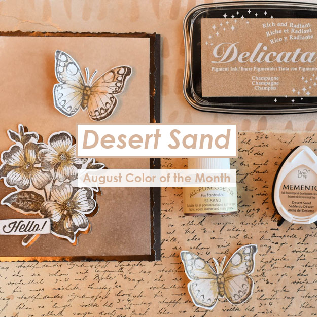 Color of the Month for August is Desert Sand. This light cream color is a beautiful way to express warm soft earthy tones. Not only is it a great compliment to chocolate browns but it looks great with a shimmery element. If you are looking for a soft shimmery gold that is not bright yellow then we highly recommend inks such as Delicata Champagne or Fireworks Shimmery Craft Spray in Desert Sand. If you are looking for a dye ink to blend with brown colors then Memento Desert Sand is also a great choice.