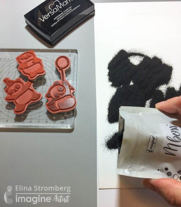 Stamp the pandas on white cardstock using clear VersaMark ink. Heat emboss the images using black Mboss embossing powder.
