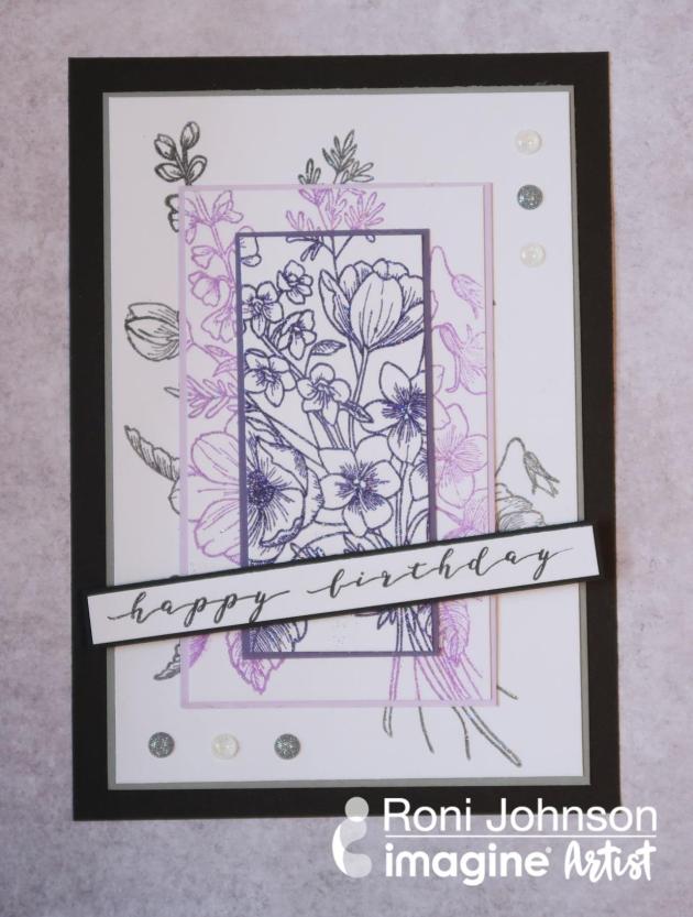 Amethyst is a lovely stone found in nature that’s color ranges from a deep rich purple to a smokey gray with all the sparkle and shimmer of diamonds. That is our color of the month and it is also the color scheme I used to create this triple layer card using Waffle Flower’s lovely Bouquet Builder 3 and a MISTI stamp positioner.