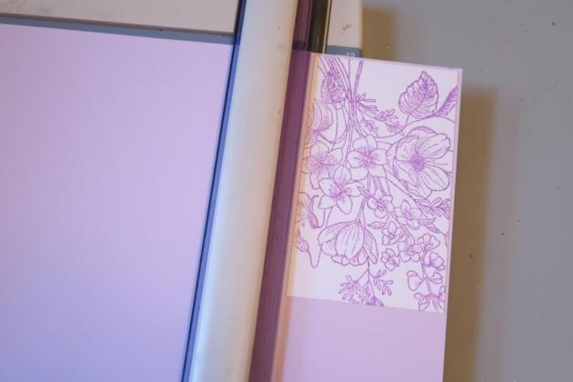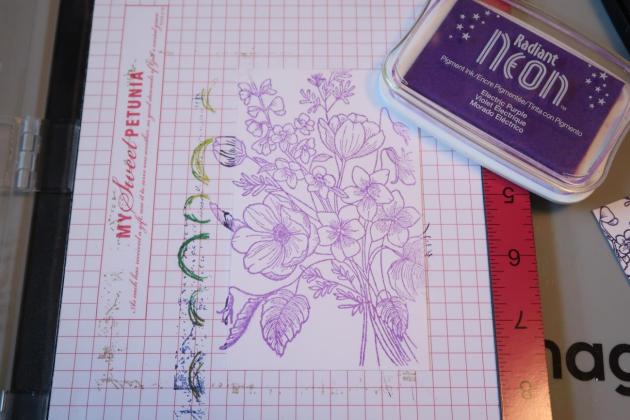 Insert the 2nd panel into the positioning tool using the grid as a guide for proper placement. Ink the stamp with Electric Purple Radiant Neon ink and close the lid to stamp the image onto the second panel. Remove this panel from the positioning tool.