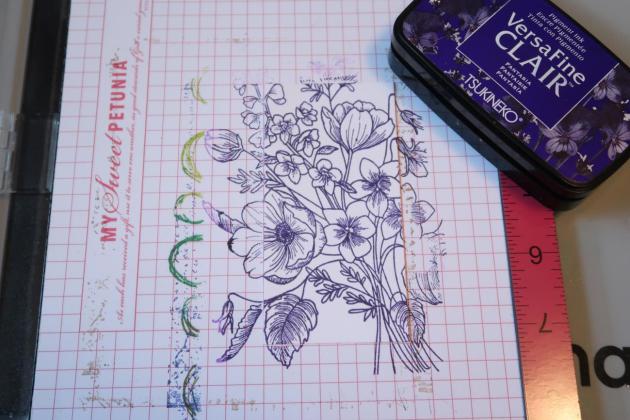 Cut 3 cardstock panels from white cardstock using the following dimensions: 4 ¾” X 6.25”, 2.5” x 4.5”, 1.5” x 3.5”. Place the largest panel in the stamp positioner and center the large flower bouquet stamp in the center of the paper. Close the lid to pick up the stamp. Ink the stamp with Morning Mist VersaFine Clair ink; press the image onto the cardstock. Remove this panel from the stamping tool, leaving the stamp in place.
