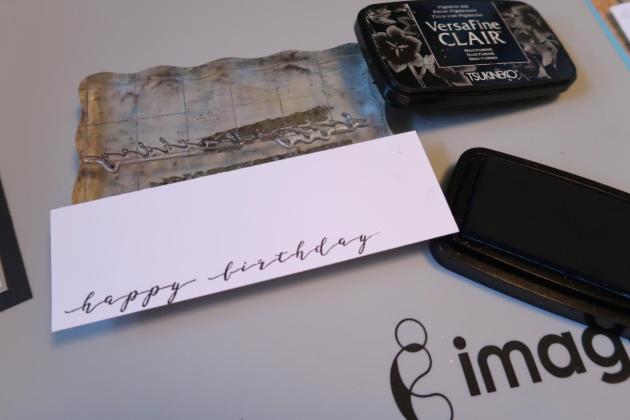 Stamp the sentiment onto a piece of scrap cardstock using VersaFine Clair Nocturne ink. Trim the excess cardstock and mat on a piece of black cardstock.
