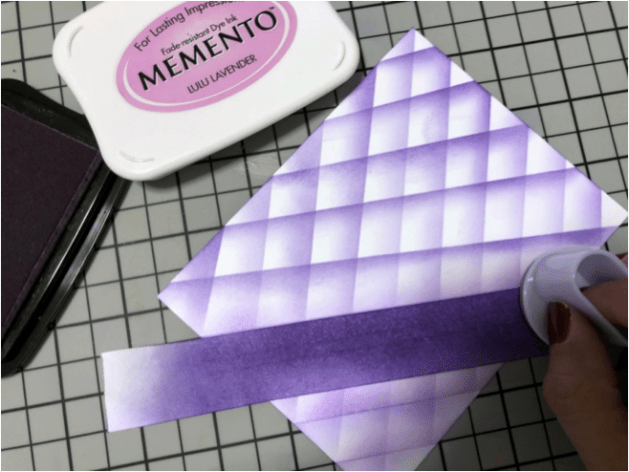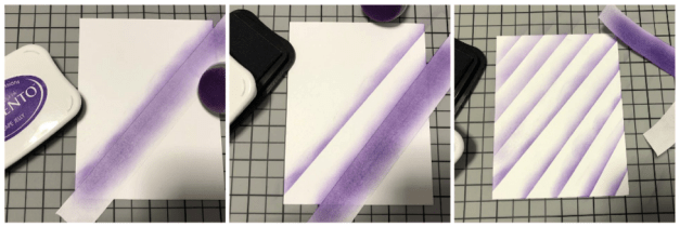 I started with a whisper white piece of cardstock and a strip of masking tape. I just created diagonal lines of color using a jumbo dauber and the Grape Jelly Memento Ink. This is a technique that you can use with any color of ink, but for this color scheme, I started with the dark purple. I used the grid side of my Craft Mat to determinate space in between each line. Mine are around 3/4″ of each in between.