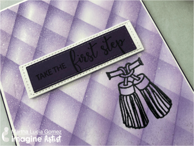 I sprayed the entire inked piece with Shimmer Sheer Sparkle to give the shimmering touch that a pair of shoes deserve. Yes, to finalize my card, I used images from the stamp set First Steep from Waffle Flower. This is a gorgeous stamp set that includes a pair of shoes with many embellishments and great encouraging sentiments.