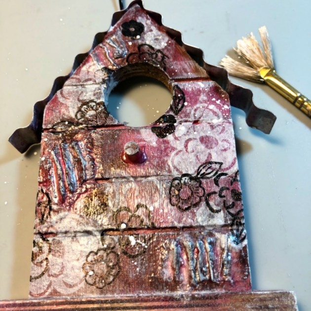 Sponge on Chocolate Brown StazOn Pigment to portions of the birdhouse.