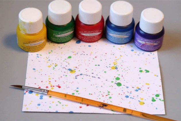 Cut a piece of white cardstock 4” x 5.25”. Flick a variety of colors of All-Purpose Ink onto the card panel using a paintbrush. Rotate the card panel with every application of ink so the splatters come from different directions for a more natural look. Set the panel aside to dry.
