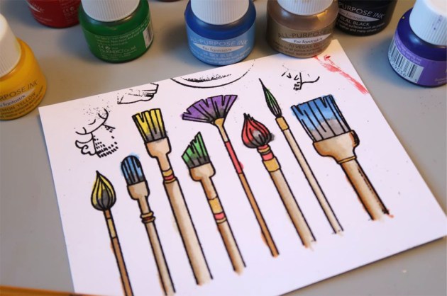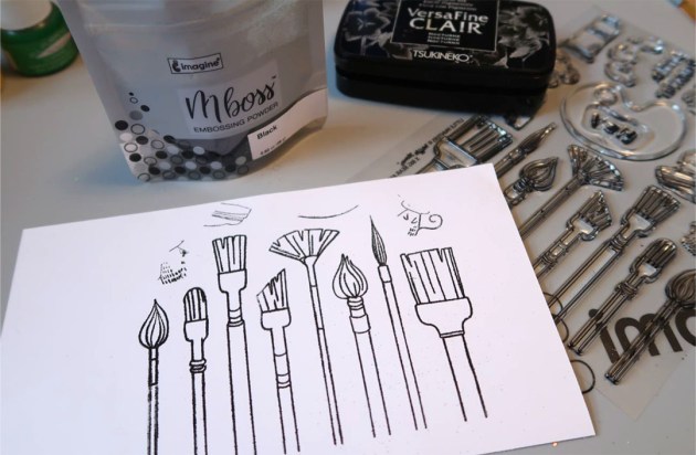 Stamp the paintbrushes onto a piece of white cardstock using VersaFine Clair Ink; stamp 3 tubes of paint onto a separate piece of white cardstock using the same ink. Sprinkle Black Mboss embossing powder over all of the images; shake off excess powder and return it to the pouch. Melt the embossing powder with a heat tool and let the embossed images cool.