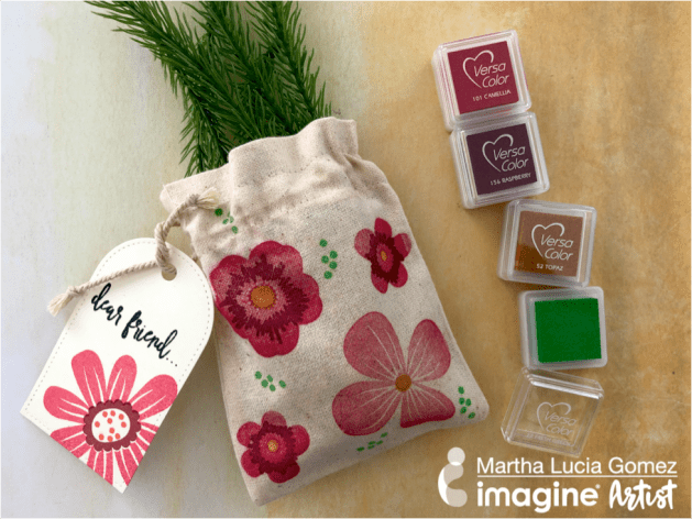 Hi there, Martha Lucia here! Today, I have a fun project to easy stamping on fabric. I used a muslin bag with our VersaColor inks and clear stamps.