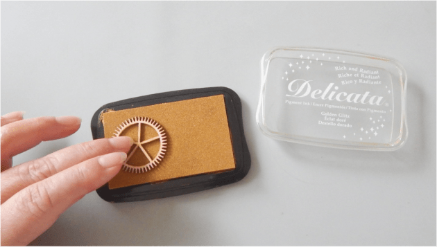 To color the gears, lightly pounce the gears on the Golden Glitz Delicata Inkpad. Repeat this step with the Shimmery Silver and Celestial Copper Delicata Inks. Allow the inks to completely dry or to speed up the process with a heating tool.