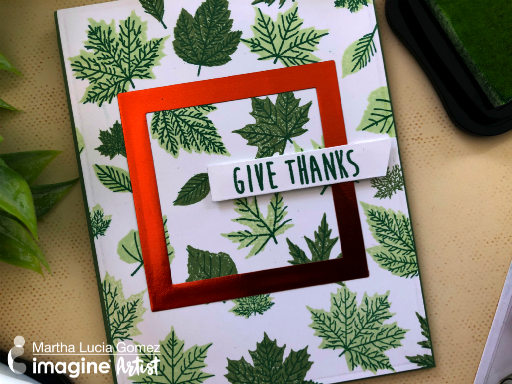 Resize your layer and paste it with double-sided foam tape over your card base. To cut mine, I used the large Embossed Edge Square Frame from Kat Scrappiness. In a separate piece of paper, stamp the sentiment, “Give Thanks”. I used one sentiment included on the stamp set Fall Greetings from Joy Clair and Cottage Ivy Memento Ink. Finalize your card adding a colorful frame. I used Marigold/Gold Glossy Rinea Foiled Paper and embossed edge square die cuts from Kat Scrappiness to create mine.