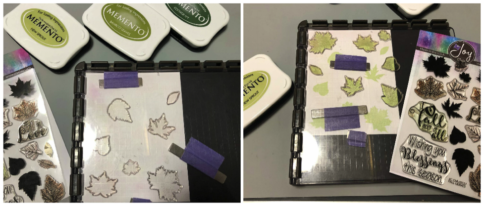 Stamp the solid image of the leaves with the lightest color of your Memento Ink. I used New Sprout and a stamping tool to stamp several images at once, but you can use an acrylic block to make the same. With the two darker colors of Memento Ink stamp the lines inside of the first images stamped. I used Bamboo Leaves and Cottage Ivy Memento colors.