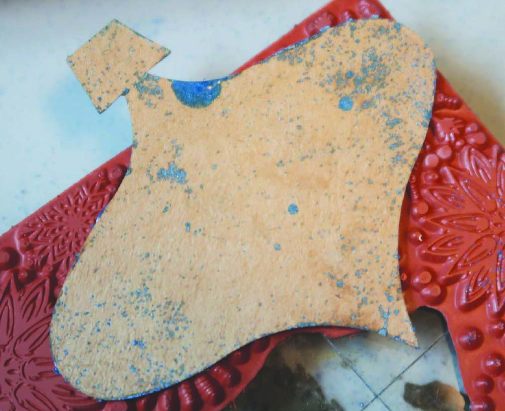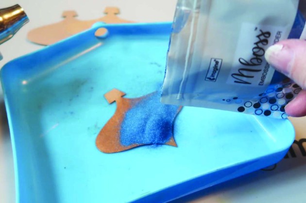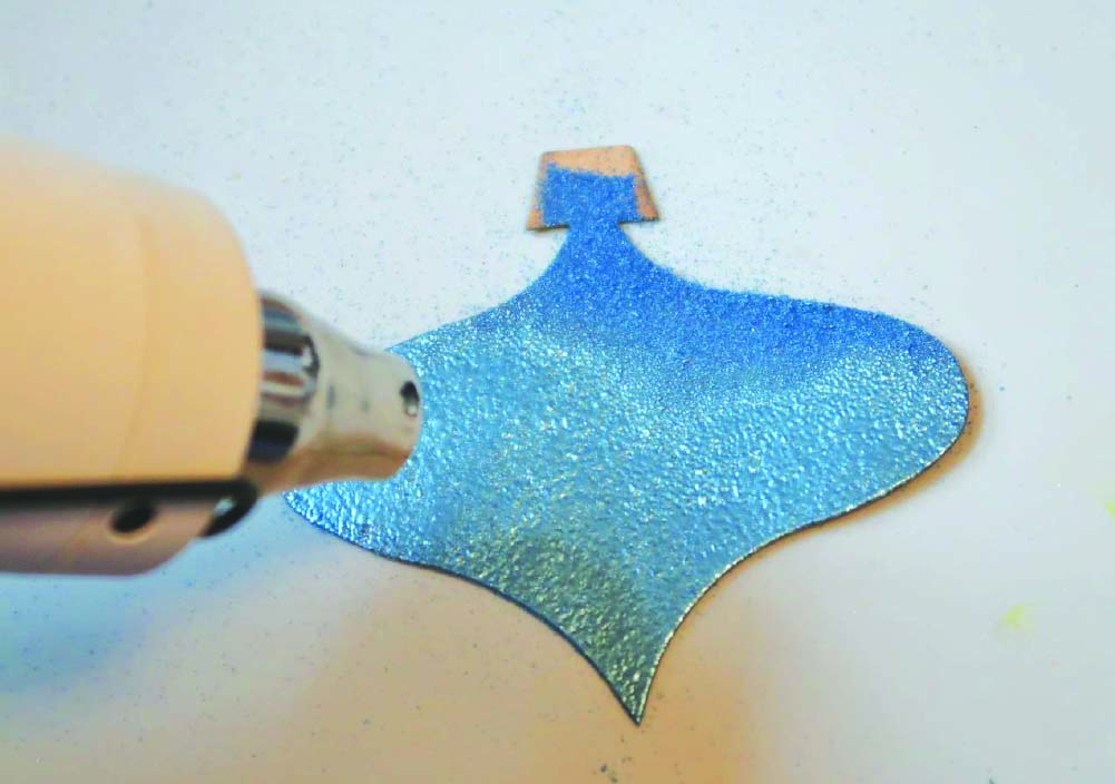 Pour desired color of Mboss embossing powder over the ornament, shake off and reserve excess powder for future use.