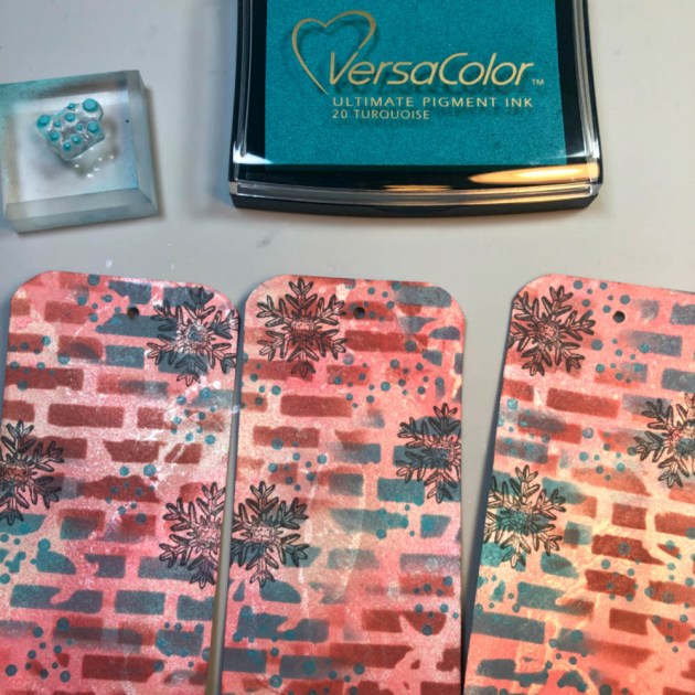 Sponge brick stencil pattern onto tags with VersaColor Brown and then repeat with Turquoise.
