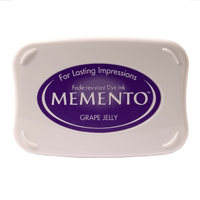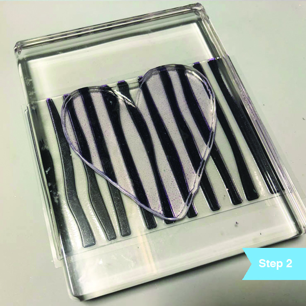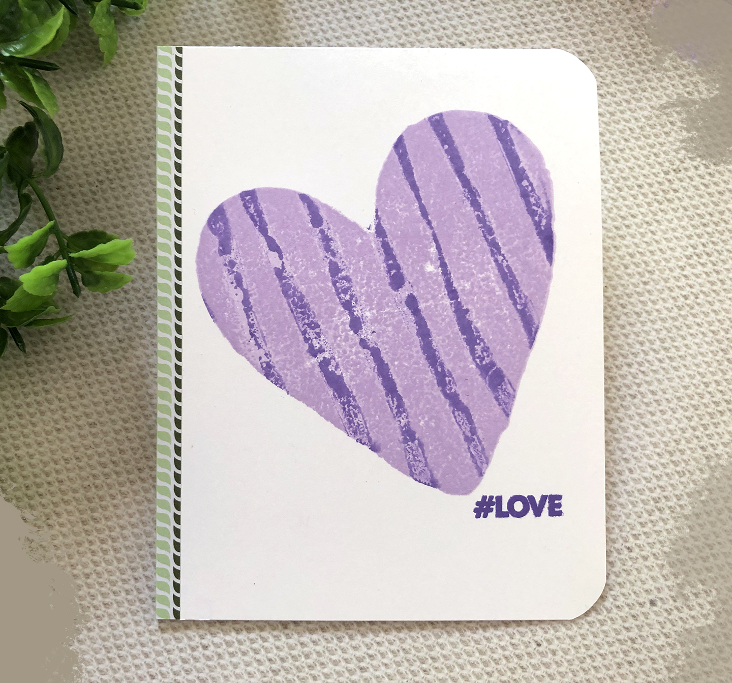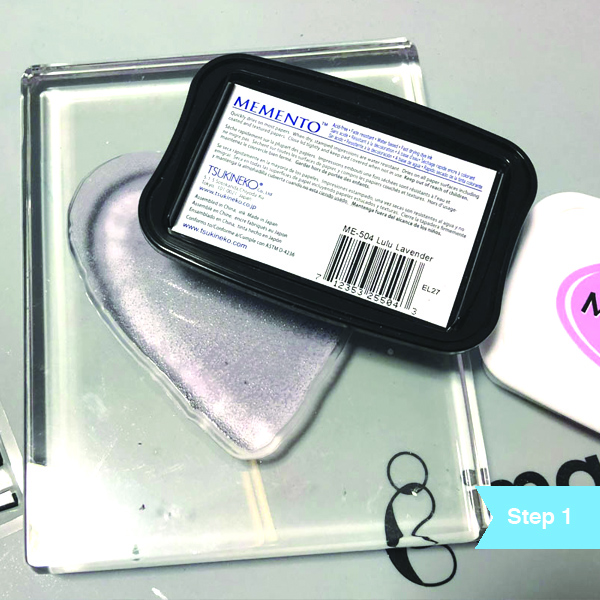 Select the stamps that you want to use and the colors of the ink. Use a light color for the solid image and dark color for the textured or detailed image. Place the stamps over different acrylic blocks and ink well with the corresponding ink. Here I selected a heart stamp and inked it with Memento in Lulu Lavender. Then I choose a stripe stamp and inked it with Memento in Grape Jelly.