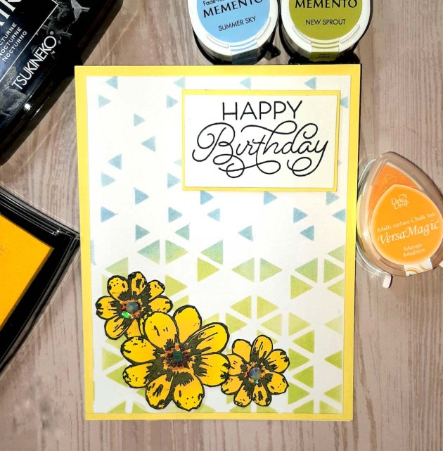 See how to create a Quick and Easy Birthday Card using a stencil and sponge flower technique. When you learn how to color with a simple sponge and pigment ink blend there is no need for extra coloring media such as color pencils and watercoloring. Save dry time and create a beautiful blend with VersaColor and VersaMagic inks.