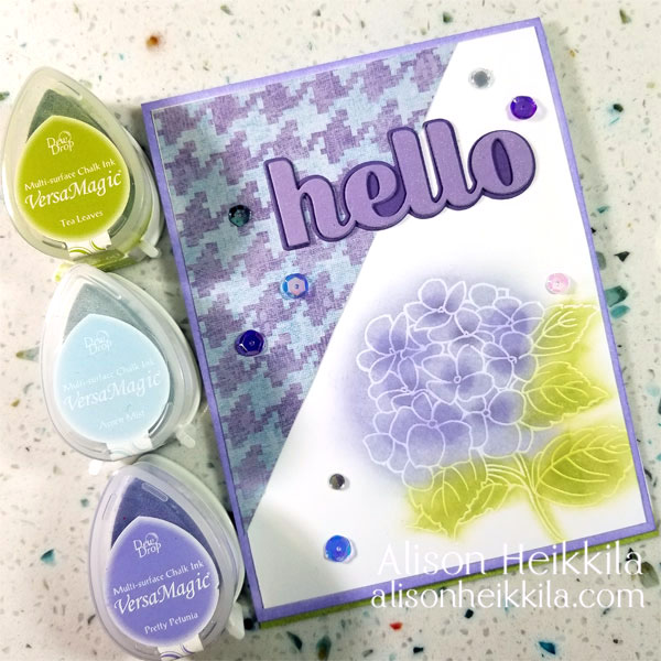 Alison writes: VersaMagic Inks are some of my absolute favorites because of the soft chalky finish they have, plus their blend-ability. I knew they would be perfect for this lovely hydrangea, and by using blending brushes, I colored it up very quickly. For shine, I added some sequins with On Point Glue, which is the number one liquid adhesive I reach for.