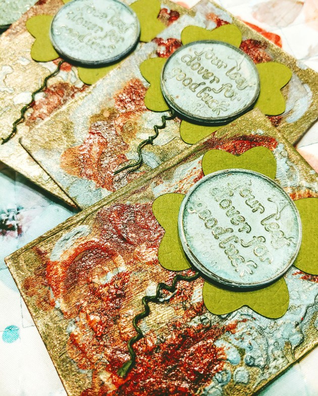 Terre used Memento Tuxedo Black, StazOn Metallic Copper, All-Purpose Ink in Mint Green and Fireworks Craft Sprays to create a set of Shamrock themed mixed media cards.