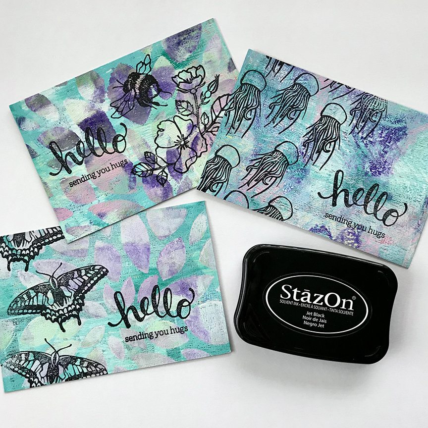 I hope you are all well. These postcards were created so that our family could send them to loved ones we know could use a little cheering up. We used cereal boxes from the recycling bin, acrylic paint, and StazOn ink. I hope they may inspire others to use materials they may already have in their home to send a quick note to their loved ones as well.
