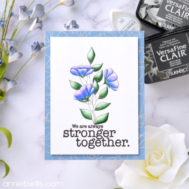 I stamped the floral image onto Strathmore Bristol smooth paper with Morning Mist VersaFine Clair Ink and colored it with Zig Clean Color Real Brush Pens. Once dry, I stamp the sentiment beneath the floral bunch in Nocturne VersaFine Clair Ink. This was mounted using foam adhesive onto a background created by stamping blue cardstock with leafy branch line art images using Platinum Planet Brilliance Ink.