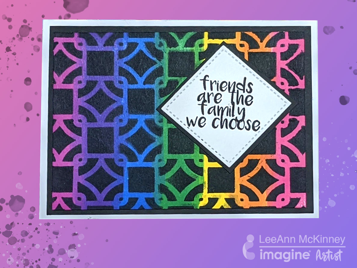 Hi friends, LeeAnn here showing an easy technique to make a card that looks like it has an etching effect. Using just a rainbow selection Memento Dye inks, and a stencil this card was so fun to make and can be altered with colors and stencil for any occasion. Bonus Material: See how to cover a slip-of-hand with an easy fix!